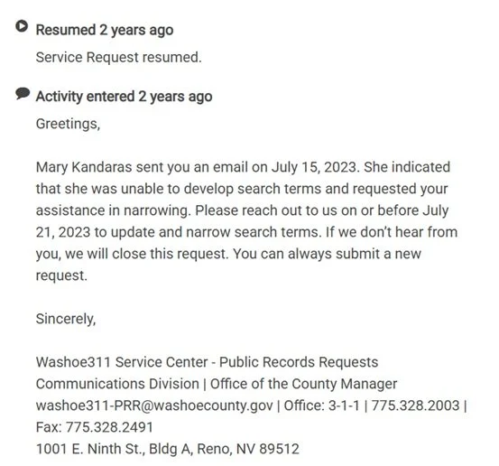 Public records compliance in Washoe County often feels optional, which it isn’t. And when the problem is consistent, it’s fair to assume it’s top-down. The “top,” in this case, is DA Hicks. Reviewing public records requests and producing them in a timely manner is literally his office’s job—yet delay after delay seems to be the default response.