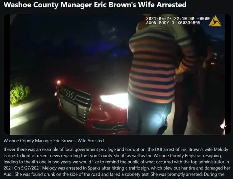 Then there’s the unforgettable body-cam video of Brown’s wife reminding officers—while being arrested—that her husband was the Washoe County Manager. Even more unforgettable? The special treatment that followed.
