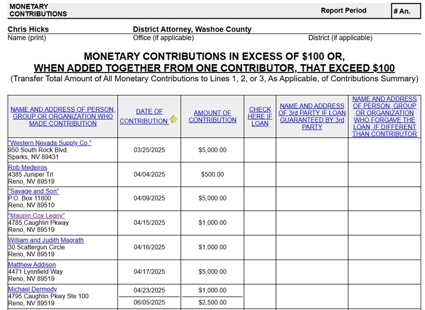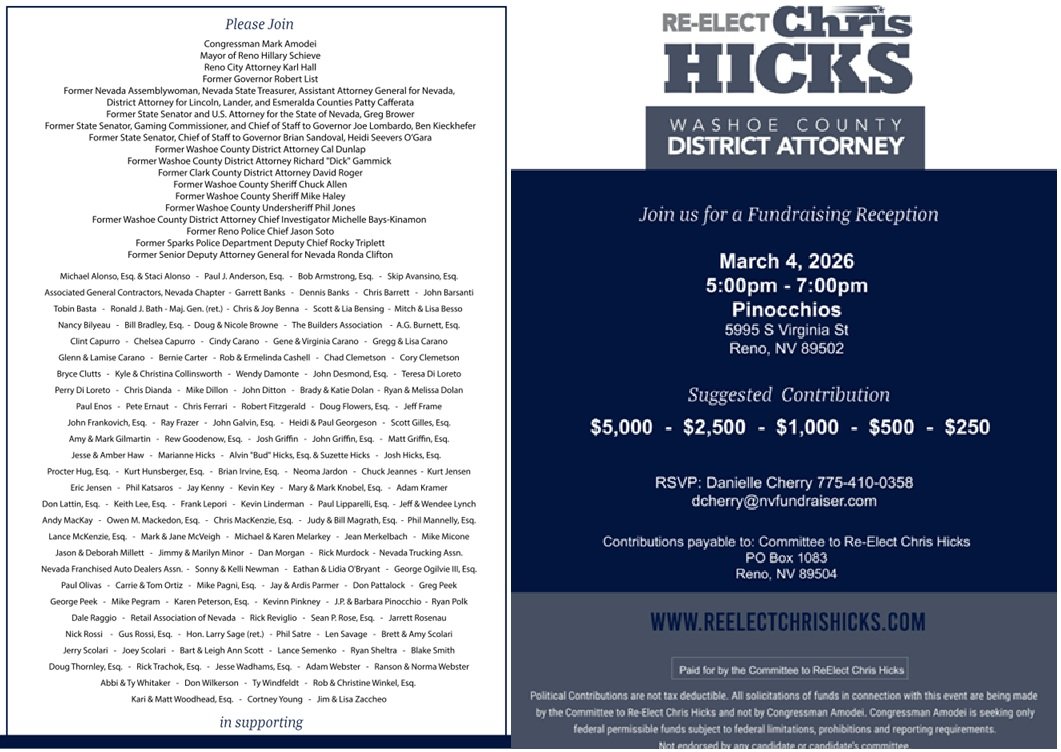 When the fundraiser invitation for Chris Hicks’s March 4, 2026 event at Pinocchio's Bar & Grill began circulating, one couldn’t help but notice the host committee reads like a Reno “who’s who.” Business leaders, attorneys, familiar names.