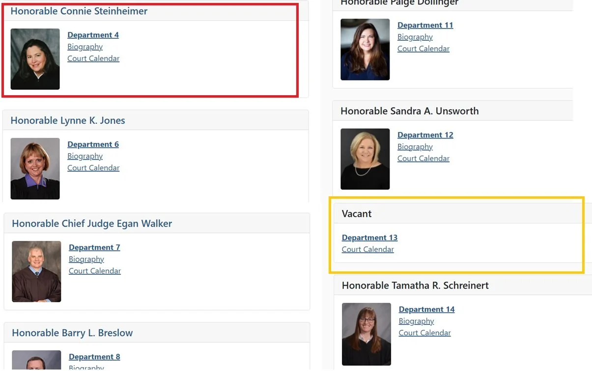 Call the court and ask them where, oh where, is Judge Steinheimer. The vacant Department 13 is due to Bridget Robb needing to resign because of alledged stalking. She has an upcoming court hearng.
