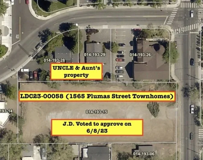 But what he didn’t say during that vote? That his uncle and aunt own two parcels directly next to the project site. Yes — immediate family with a direct financial interest in the outcome. The public heard crickets. The vote went through.