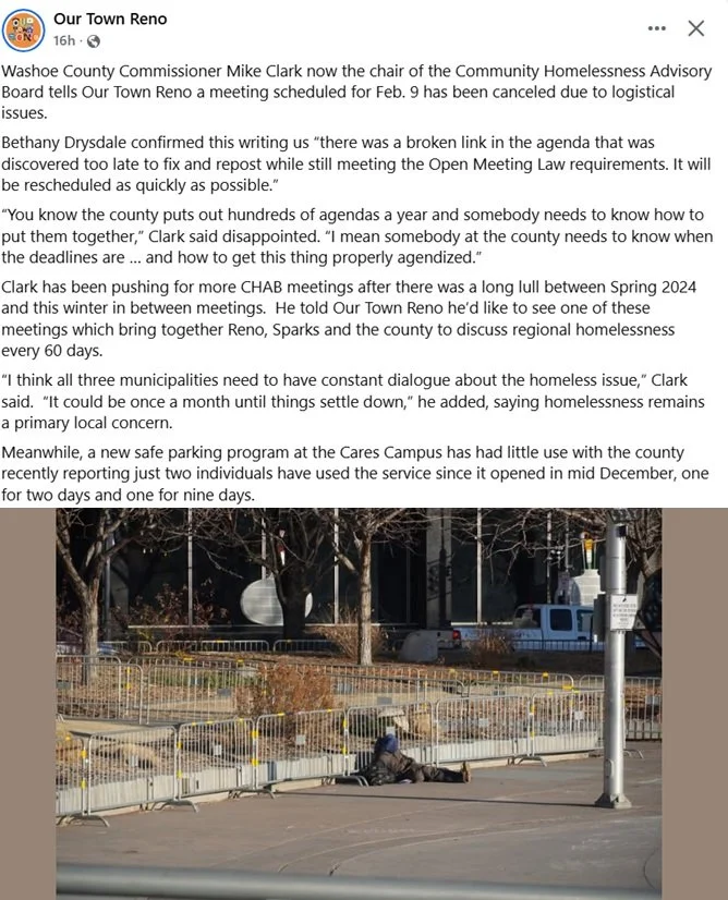 Picon applauds the journalistic professionalism of Our Town Reno, which reported yesterday that the CHAB: Community Homelessness Advisory Board meeting scheduled for February 9 was canceled due to “logistical issues.” One of Washoe County’s ever-reliable messaging representatives confirmed to Our Town Reno in writing:
