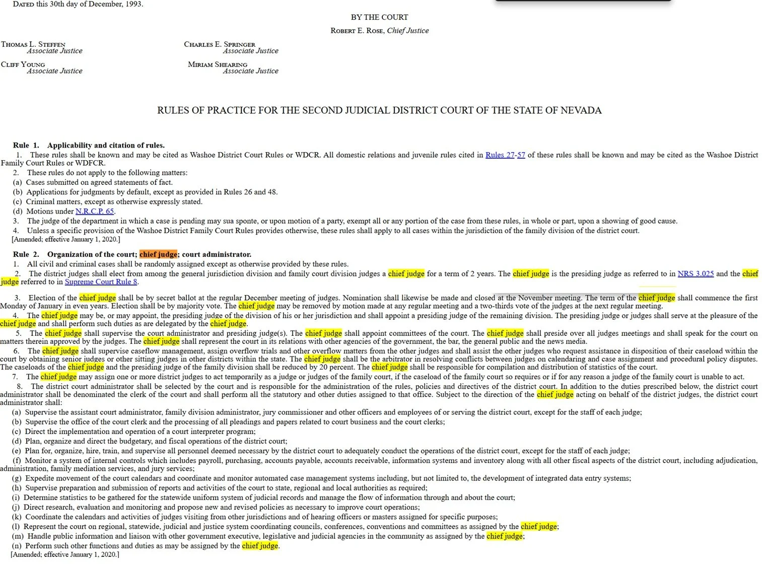 Yes, we dusted off the Rules of Practice for the Second Judicial District Court — you know, the thrilling bedside material governing how things actually work over at the courthouse. And we went straight to Rule 2, because that’s where the magic of the Chief Judge lives.