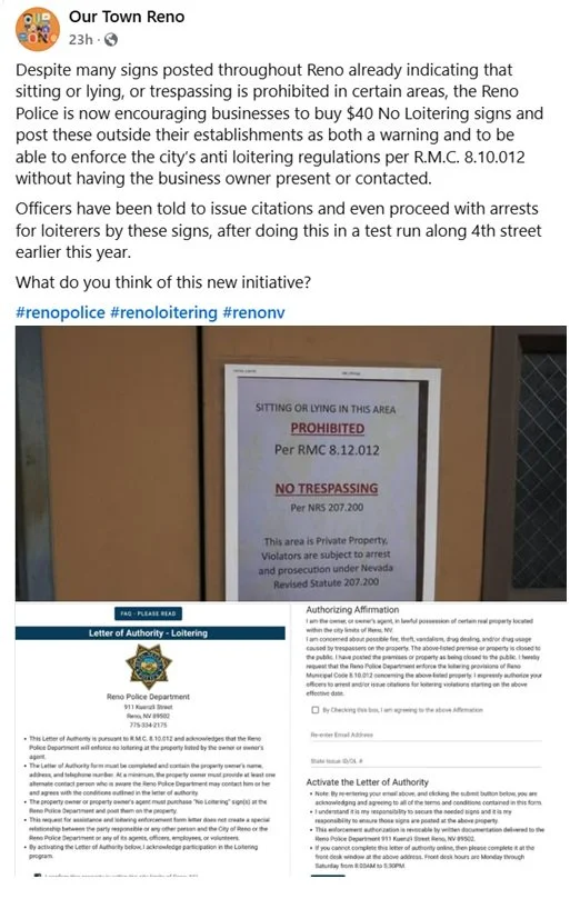 When Public Safety Becomes a Private Purchase: In a move that perfectly encapsulates the dysfunction of Reno's city leadership, the Reno Police Department has launched a "No Loitering Program" that asks local businesses throughout the city, including the struggling downtown businesses to pay $40 each for signs that give police permission to do their jobs. Yes, you read that correctly: businesses fighting to survive in a downtown that city officials claim they want to revitalize are now being asked to purchase the privilege of having police remove loiterers from their properties.